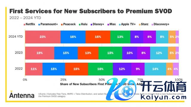 到了 2024 年年底,新用户首选 Netflix 的比例接近四分之一,同期受伤的主若是 Hulu,迪士尼,Apple TV+ 和 Discovery。